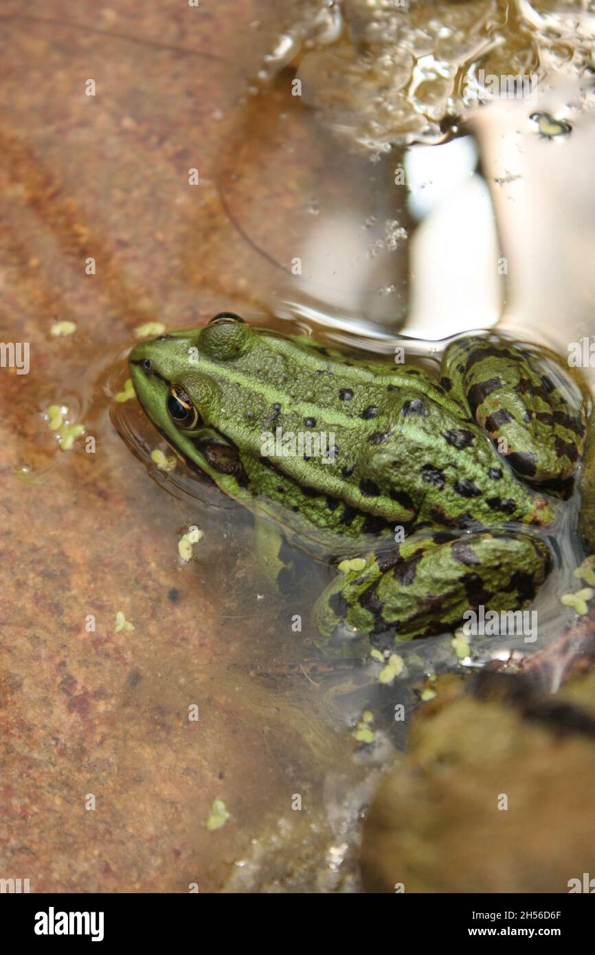 Common Water Frog Sitting In Shallow Calm Reflecting Water Stock Photo